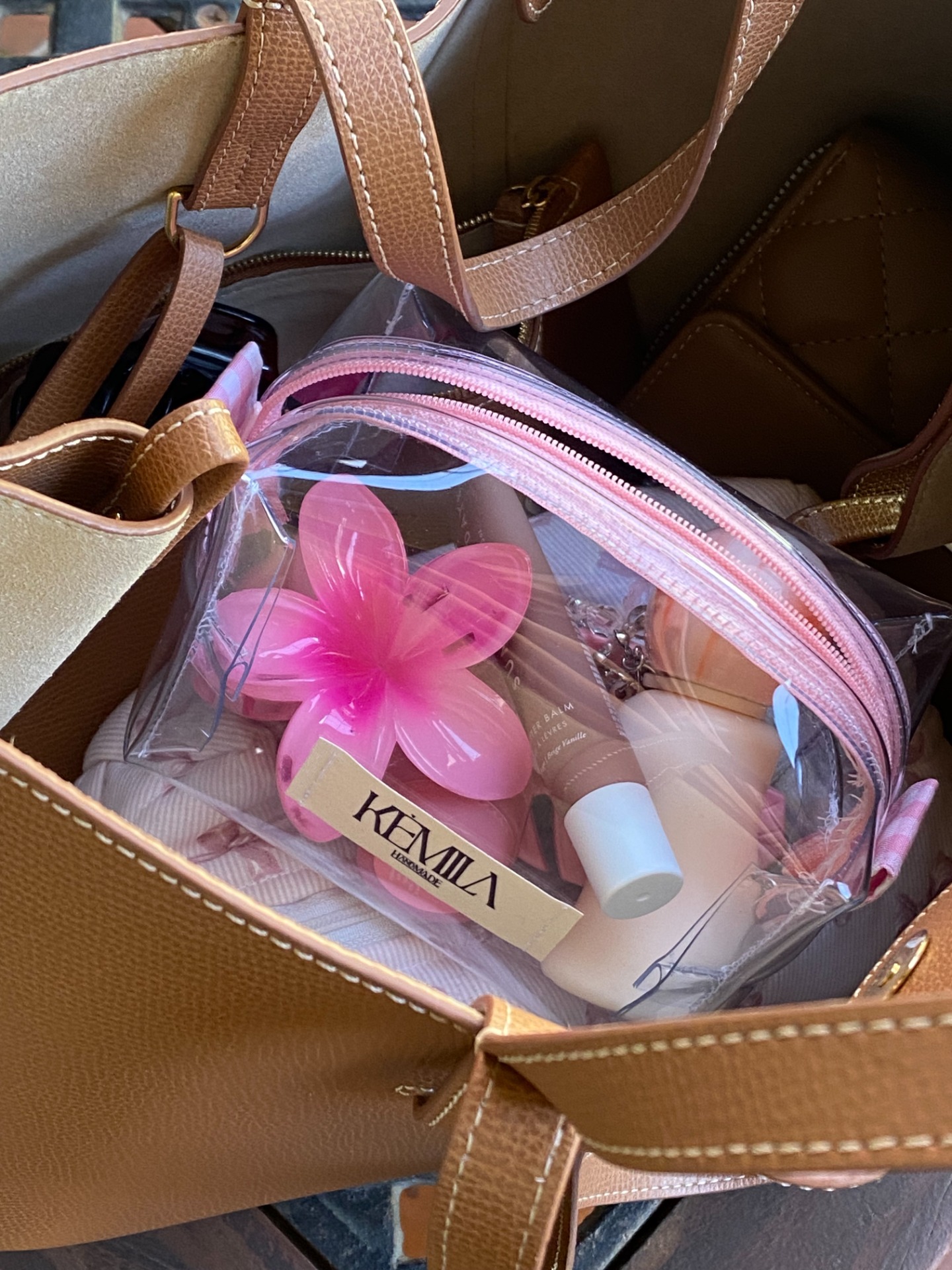 small size, PVC trasparente, con zip rosa e linguette vichy rosa.
