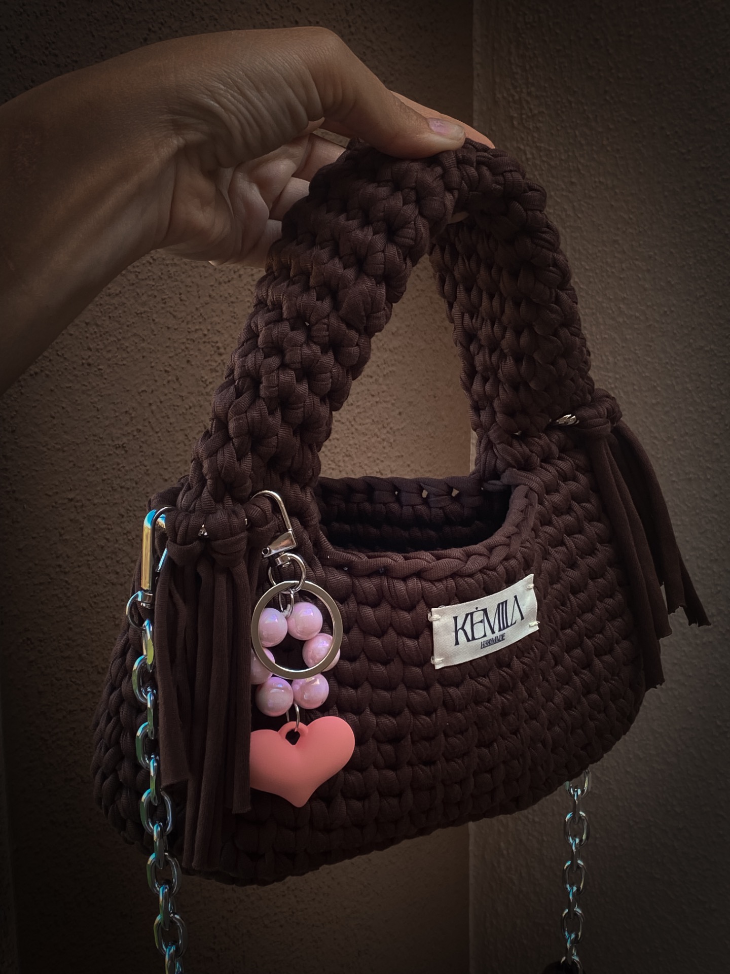 boho bag con frange laterali + anelli, tracolla in acciaio estraibile + charm